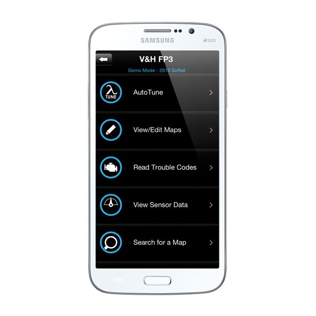 The latest in digital communication with your bike's fuel injection system is done via bluetooth with your smartphone, either Android or iPhone. Flash technology is used to recalibrate the OEM fuel map. The OEM fuel map will be stored in the FP3 so the ECU can always be returned to OEM factory condition. Stationary manual adjustments will let you adjust the fuel map, EITMS (Engine Idle Temperature Management System) and idle speed, AFR (Air Fuel Ratio) can be set slightly richer or leaner. Ignition timing can be adjusted and includes a rev limiter. New maps can be downloaded from Vance & Hines and through the on-bike sensors the system can be run in AutoTune mode, which enables the bike to recalibrate the fuel map real time to the specific conditions and even the quality of fuel that is used. When the Android or iPhone is installed on the bike, live sensor data, like speed, RPM, cylinder head temperature, voltage, gear selection etc. can be seen on the display of the smartphone. Note: Once the FP3 is used on a bike it is 'mated' to that specific OEM ECU. You will not be able to use the same FP3 on another bike. The OEM fuel map is stored in the FP3, therefore the ECU can always be returned to the OEM factory set-up.